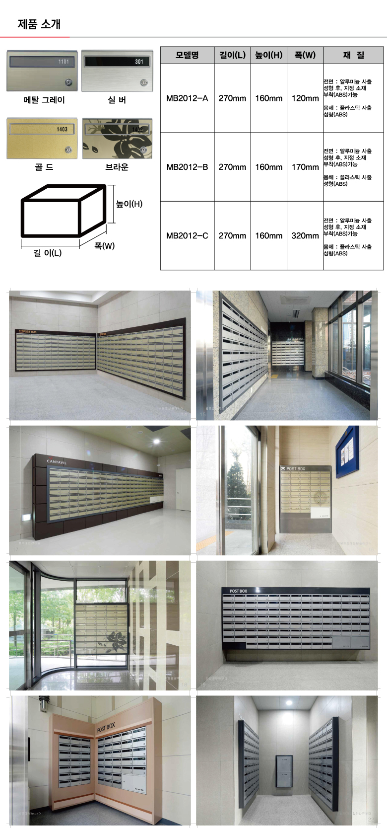 전면의 알루미늄 사출 성형 가공으로 제품이 견고하며 다양한 색상과 디자인이 가능한 제품입니다. 우편문 수취에 용이하도록 오목판을 제작해 만든 우편함입니다.(양문형 가능)