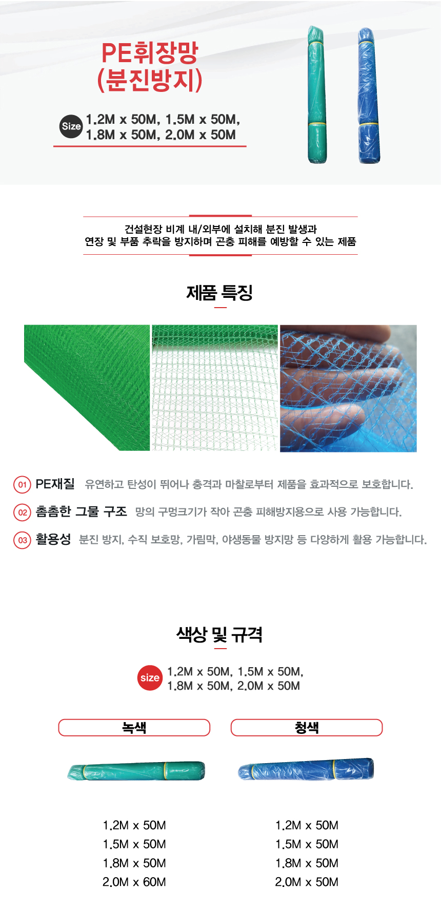 규격 2M x 50M / 1.8M x 50M / 1.5M x 50M / 1.2M x 50M